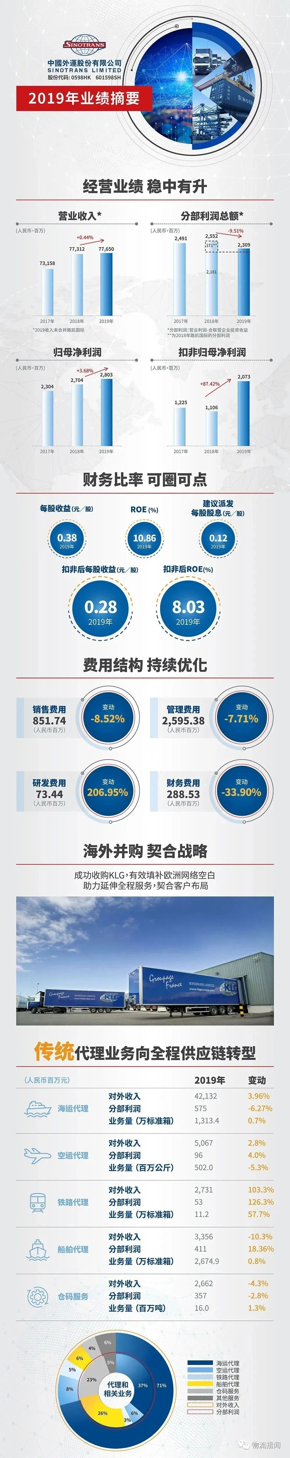 據(jù)悉,2019年,中國(guó)外運(yùn)實(shí)現(xiàn)營(yíng)業(yè)收入776.50億元,同比增長(zhǎng)0.44%(可比口徑下實(shí)現(xiàn)增長(zhǎng)2.4%);分部利潤(rùn)實(shí)現(xiàn)23.09億,可比口徑下實(shí)現(xiàn)增長(zhǎng)5.9%。實(shí)現(xiàn)歸母凈利潤(rùn)28.03億元,同比增長(zhǎng)3.68% ;實(shí)現(xiàn)扣非后的歸母凈利潤(rùn)20.73億元,同比增長(zhǎng)87.42%。每股收益為0.38元人民幣??鄯呛蟮腞OE增長(zhǎng)了3.08個(gè)百分點(diǎn)。