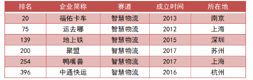 另外,排名前100的企業(yè)有第20位的福佑卡車和第75位的運(yùn)去哪。福佑卡車作為技術(shù)驅(qū)動(dòng)型公路貨運(yùn)平臺(tái),近日已赴美遞交IPO申請(qǐng),計(jì)劃在納斯達(dá)克上市。而一站式國(guó)際物流在線服務(wù)平臺(tái)于前日宣布獲得中信資本領(lǐng)投,襄禾資本和老股東跟投的新一輪融資,D1輪累計(jì)融資額達(dá)1.5億美元,總?cè)谫Y金額超過(guò)了3億美元。