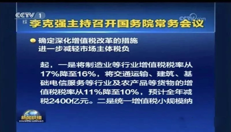 會(huì)議指出,過(guò)去五年通過(guò)實(shí)施營(yíng)改增累計(jì)減稅2.1萬(wàn)億元。按照黨中央、國(guó)務(wù)院部署,為進(jìn)一步完善稅制,支持制造業(yè)、小微企業(yè)等實(shí)體經(jīng)濟(jì)發(fā)展,持續(xù)為市場(chǎng)主體減負(fù),會(huì)議決定,從2018年5月1日起,一是將制造業(yè)等行業(yè)增值稅稅率從17%降至16%,將交通運(yùn)輸、建筑、基礎(chǔ)電信服務(wù)等行業(yè)及農(nóng)產(chǎn)品等貨物的增值稅稅率從11%降至10%,預(yù)計(jì)全年可減稅2400億元。