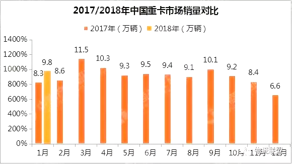 據(jù)統(tǒng)計數(shù)據(jù)顯示,自2016年10月開始延續(xù)至2017年10月,國內(nèi)重卡市場連續(xù)13個月爆發(fā)式增長!2017年全年,國內(nèi)重型貨車產(chǎn)量為114.97萬輛,同比增長55.07%,銷量為111.69萬輛,同比增長52.38%。而18年1月重卡市場的“開門紅”除了同環(huán)比雙雙增長以外,同時也打破了去年1月銷量8.3萬輛的紀錄。